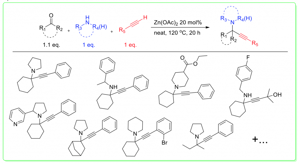 Propargylamines are a unique class of compounds, serving as versatile synthons for a variety of organic transformations and possessing intrinsic value due to the bioactive nature of certain members of their diverse family. Consequently, their synthesis has been a topic of intense research, which has given rise to a multitude of catalytic reaction systems proceeding through the C-H activation of terminal alkynes and notably involving the use of sustainable metals. Recently, the KA2 coupling reaction (Ketone-Amine-Alkyne) emerged, providing facile access to tetrasubstituted propargylamines. In this regard, our research group has undertaken the development of novel, sustainable catalytic systems for the KA2 coupling, based on zinc, manganese or copper catalysis. As demonstrated by the results shown in the scheme below, our zinc-based protocol has a wide substrate scope, leading to the functionalization of challenging molecular scaffolds. Related studies on extensions and modifications of this system as well as the development of related systems are underway, with so far promising results. Importantly, all protocols have been designed to adhere strongly to the principles of Green Chemistry.