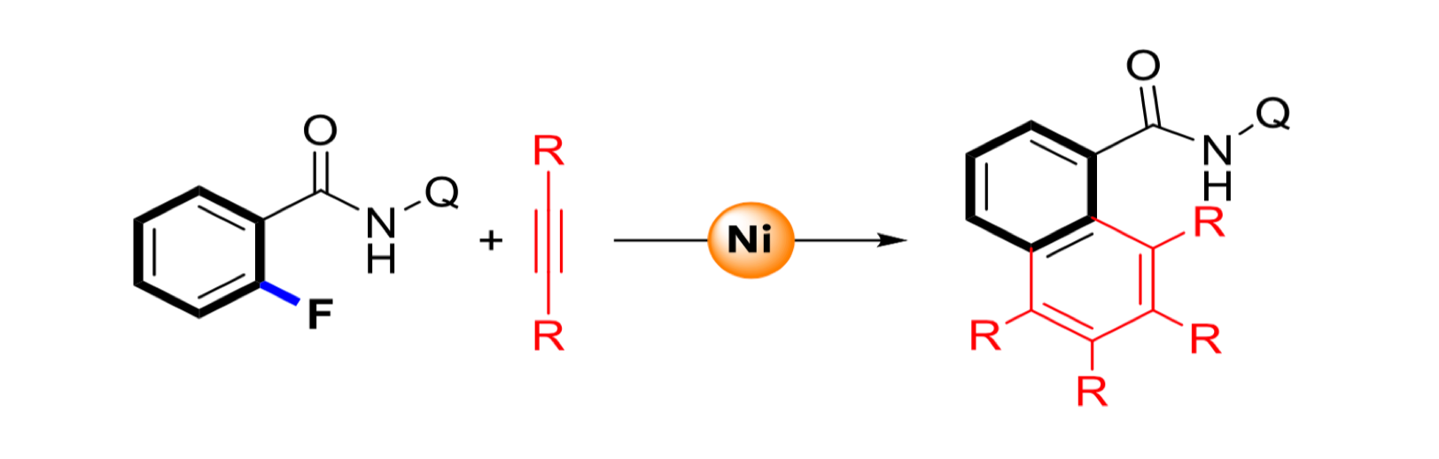 Albeit the great interest in the synthesis of fluorinated compounds due to their enhanced metabolic stability, lipophilicity and bioavailability,[1] the selective activation of C-F over C-H is of interest in the detoxification of fluorinated compounds present in waste water. Nickel has emerged as one of the metal of choice due to its ability to activate C-F bonds.[2] Here we study the selective activation of C-F versus C-H bonds in fluorinated arene model compounds. The use of directing groups is crucial to achieve site-selective functionalization. Mechanistic insights of the aromatic homologation reaction are also discussed.