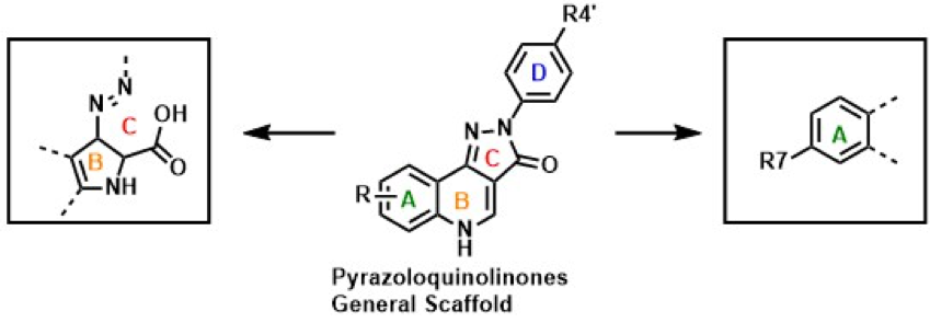 Among the allosteric modulators identified so far, pyrazoloquinolinones (PQs) have been extensively studied in the last decades for their interesting pharmacological properties on GABAA receptors [3]. Over the years, many modifications of the general PQ scaffold have been performed in order to accomplish compounds with better properties in terms of selectivity, potency and detectability. In this work we investigated modification of ring A, B and C of the PQ scaffold. On ring A, many modifications – both in terms of position of substituents and dimensions of the ring- have been explored; among them, the introduction of substituents in position R7 resulted in compounds with functional selectivity for α6β3γ2 receptors[4, 5]. On the contrary, modifications on rings B and C are less investigated [6]. Here, we further explored the impact of R7 on activity of PQ derivatives in α6β3γ2, synthesizing a library of compounds differently substituted in position 7. Furthermore, in order to gain more insight on the effect of changes at rings B and C, we used the pharmacophore of the PQ as template to design a new scaffold, in which the size of ring B is reduced and the ring C is open. Herein we describe the synthesis and the biological properties of the resulting indole-derivatives on α1β3 receptors.