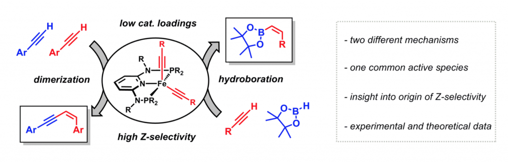 Our group recently described the synthesis and characterization of non-classical iron(II) polyhydride complexes supported by PNP-pincer ligands. These complexes were found to be catalytically active for the hydroboration or head-to-head dimerization of terminal alkynes exhibiting excellent Z-selectivity, even at low catalyst loadings and mild reaction conditions.[1] Now, we are providing detailed mechanistic insight into these types of transformations including activation of the pre-catalyst and origin of the Z-selectivity.[2] In particular, an iron(II) bis(acetylide) intermediate could be identified as common key intermediate in both cases, which, however, proceed via two basically different reaction pathways. This species as well as intermediates relevant for the elucidation of selectivity could be trapped and were fully characterized including X-ray diffraction. The proposed mechanisms are further supported by detailed DFT-calculations leading to a consistent picture of the underlying reaction pathways and the stereoselective steps of these transformations.