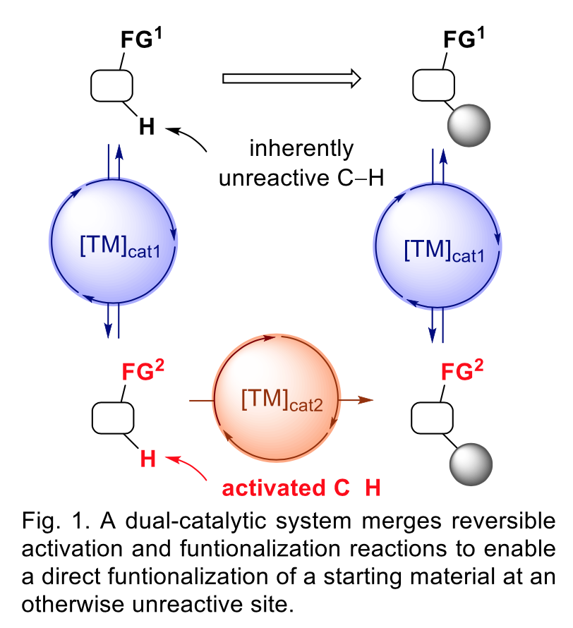 In this talk I will present our studies dedicated to the development of dual-catalytic systems that enable selective functionalization reactions of substrates at their unreactive sites, such as ubiquitous unactivated C-H bonds. Such reactions occur directly under mild conditions without the pre-activation steps and without the use of highly reactive reagents. Our strategy rests on merging a metal-catalyzed reversible reaction and a metal-catalyzed functionalization reaction (Fig. 1). For instance, we demonstrated the transient and reversible oxidation of an alcohol group by catalytic Ru-complexes enables direct arylation of the otherwise unreactive b-C-H bond of aliphatic alcohols by a Pd-catalyst, and direct g-regio- and enantioselective hydroarylation of the C=C double bond of allylic alcohols by a Rh-catalyst. Due to the mild reagents and conditions of both the reversible reaction and the functionalization reaction, the devised methodologies are general and compatible with a broad scope of substrates, including natural product-like molecules. These studies highlight the potential of the multi-catalytic approach to address challenging transformations to circumvent multi-step procedures and use of highly reactive reagents in organic synthesis.