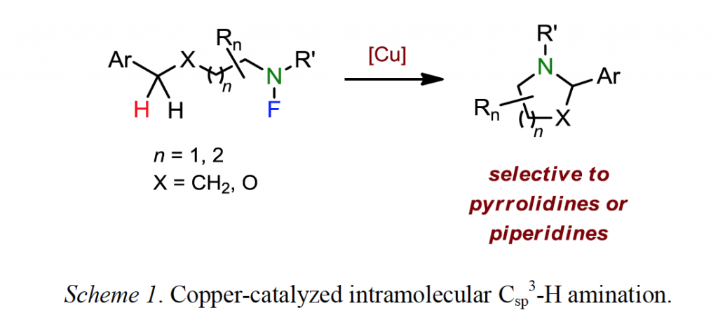 In the framework of this COST CHAOS Action, we present the results derived from a collaboration of three groups in which N-F bond acts as an effective nitrogen source and oxidant in intramolecular C-H functionalization. Copper catalyst exerts full chemoselectivity control in a new transformation, which leads to series of nitrogenated heterocycles with predictable ring size. DFT studies have led to a mechanistic proposal for such transformation.