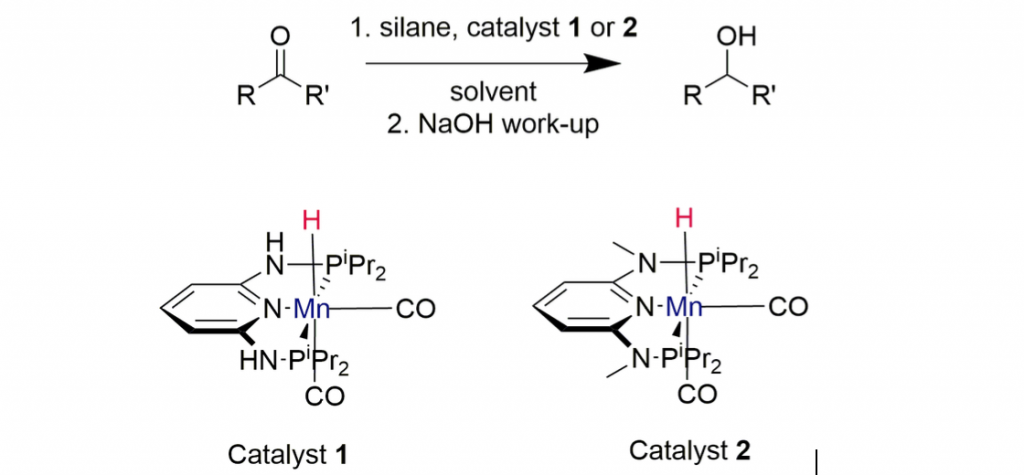 The reduction of carbonyl compounds is among the most important transformation in the field of organic chemistry. This reaction can be performed with hydrogen and a transition metal catalysts, based on precious metals as well as base metals1. Especially well-defined manganese (I) compounds are of great interest for these transformations2, since manganese is as an abundant resource. Although hydrogen is the cheapest of all reduction reagents and therefore frequently used, it has several drawbacks. Apart from being a flammable gas, (high)-pressure apertures are needed in order to perform reactions.